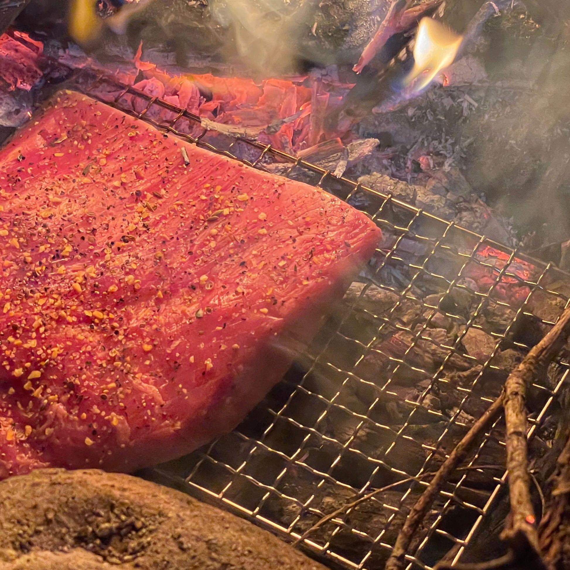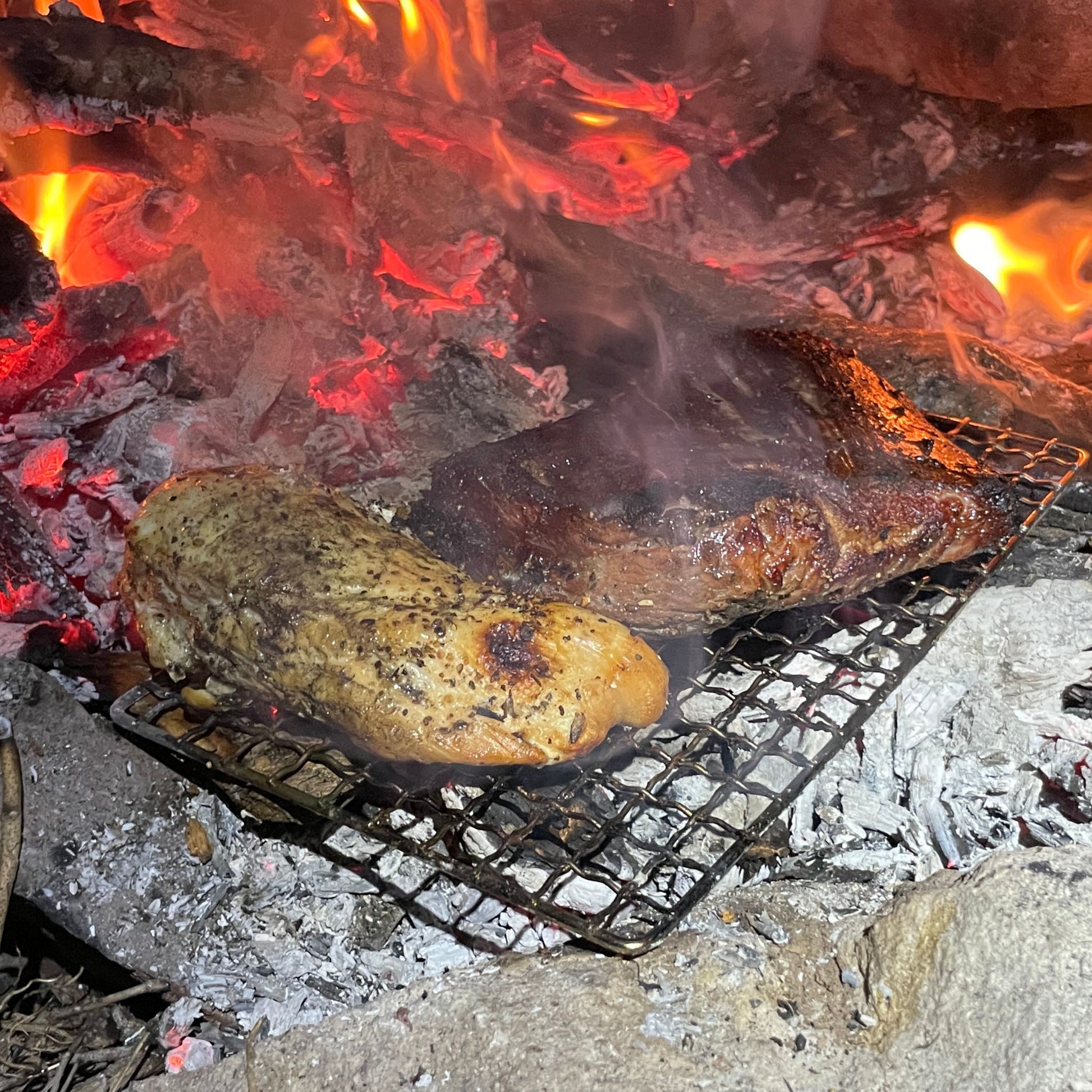 Near Zero lightweight backpacking mesh grill. Made of food-grade 304 stainless steel. Ideal for cooking fish, chicken, or steak over the fire. Includes lightweight nylon zipper carrying bag.